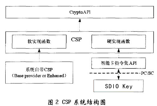 從圖1可以看出,它分為應(yīng)用層:系統(tǒng)層和加密服務(wù)提供層。處于應(yīng)用層的應(yīng)用程序通過(guò)Crypto API來(lái)調(diào)用CSP模塊提供的各種服務(wù)。